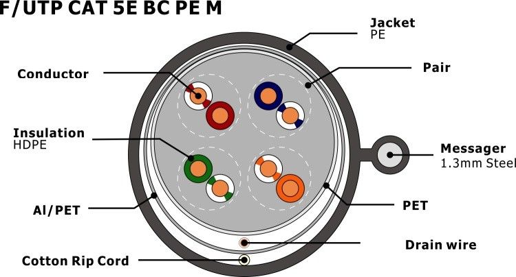 | سپر: | FTP، جفت پیچ خورده محافظ | نام محصول: | F/UTP CAT5E PE با مسنجر |